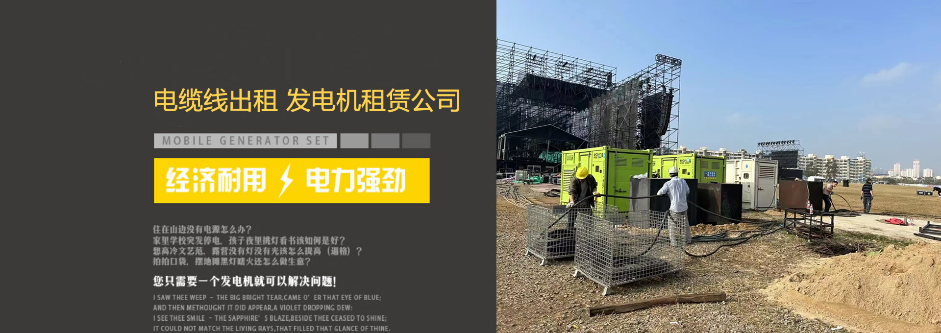 億云電力設備租賃有限公司是一家專注電纜線、發電機、配電箱、線槽板、UPS出租的公司,性能穩定,靜音省油,環保節能,可滿足不同客戶需求。我們常年為演唱會、音樂節、展會、集市、美食節、慶典、發布會、工廠、工地等缺電場所提供電源租賃服務,廠家直租,經驗豐富,租期靈活。專業員工現場安裝、調試、維護,根據客戶需要二十四小時隨時發電。